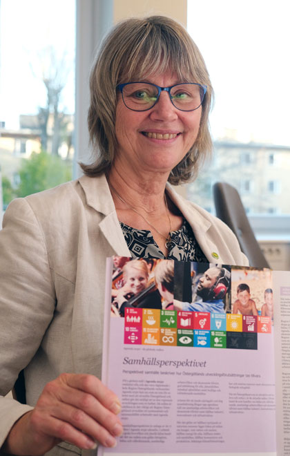 – Region Östergötland har börjat använda Agenda 2030-målen för att följa upp verksamheten, säger regionrådet Agneta Niklasson och visar den strategiska planen med treårsbudget.